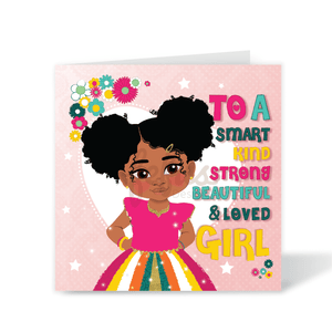 Empowering Blindian Girl Affirmation Birthday Card. Inspire your Blindian (Black & Asian) daughter with our empowering birthday card. Featuring a strong and confident character, this card celebrates her unique identity and encourages her to reach for the stars whilst affirming her qualities.