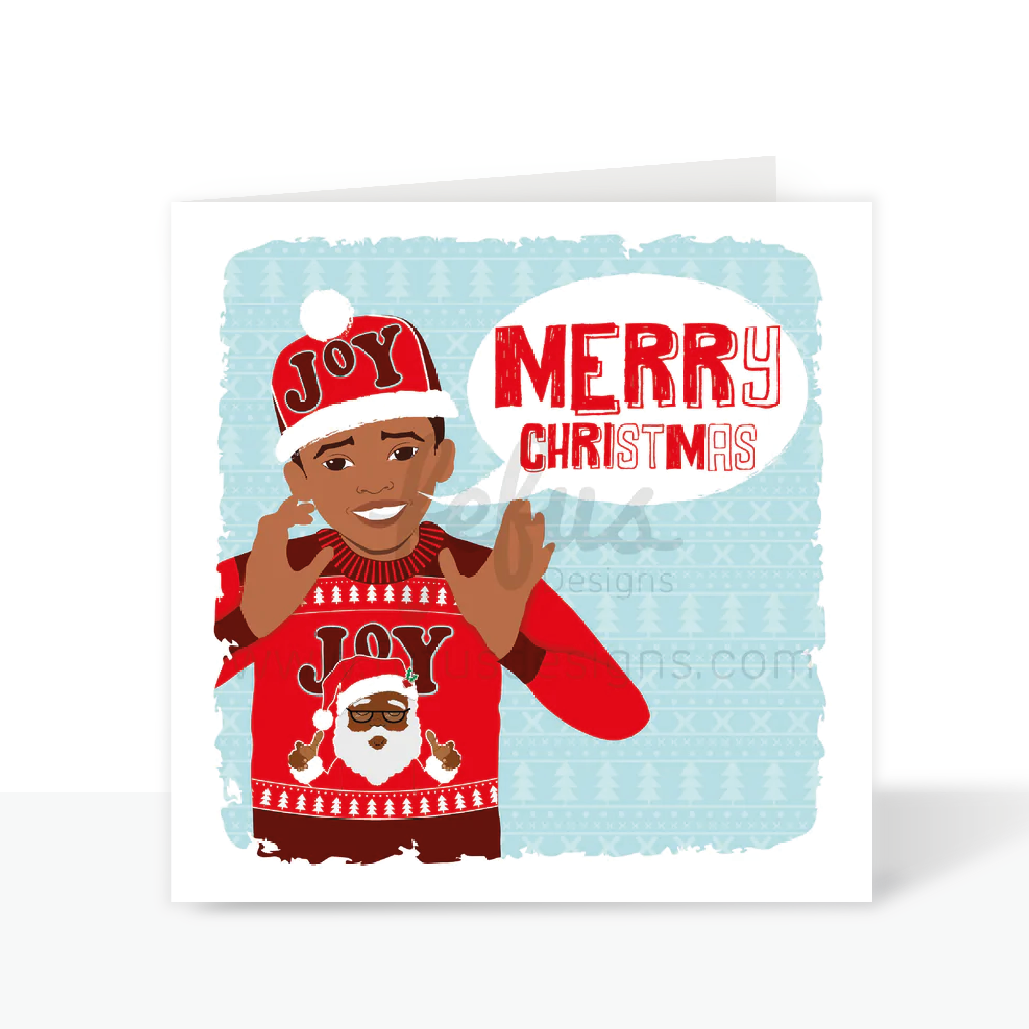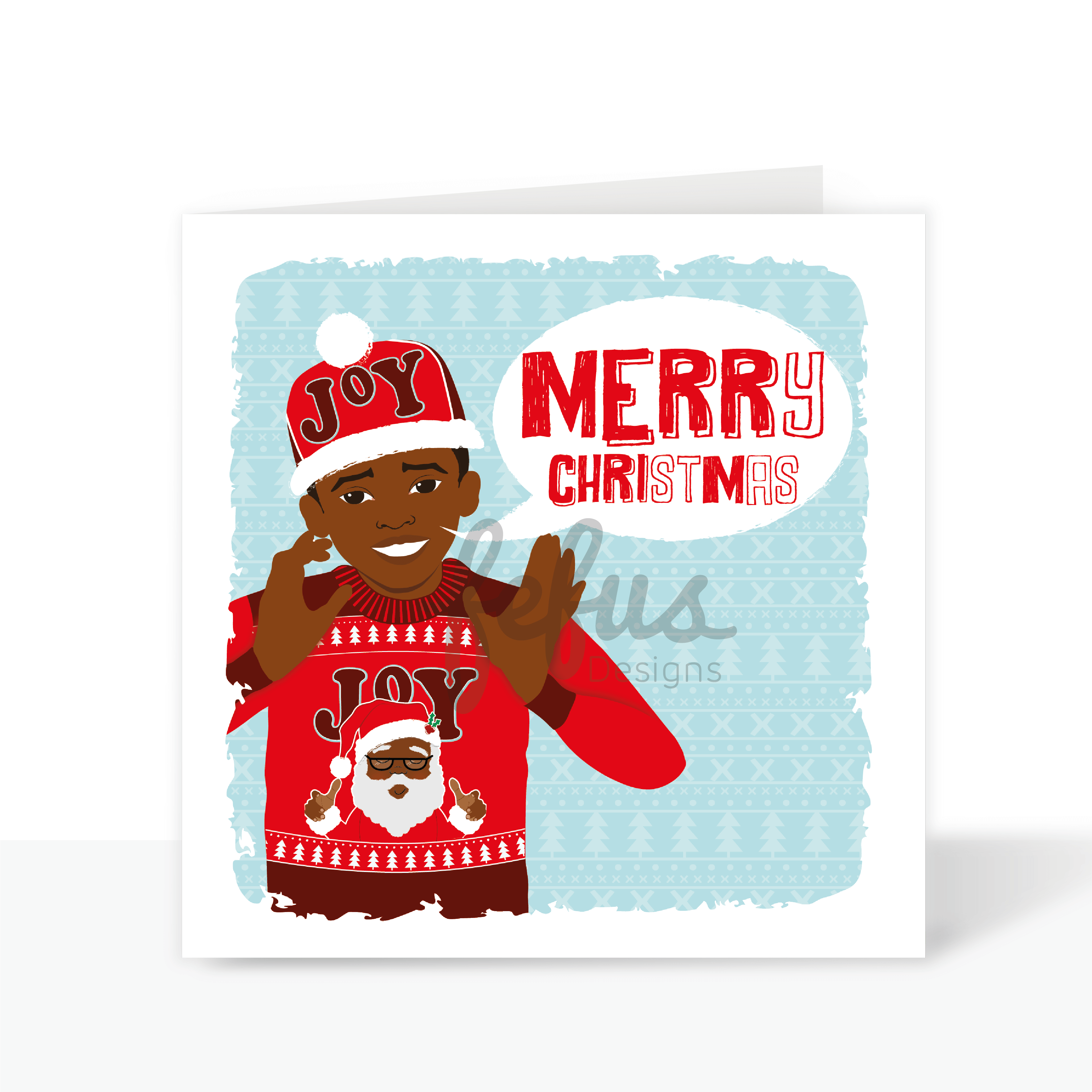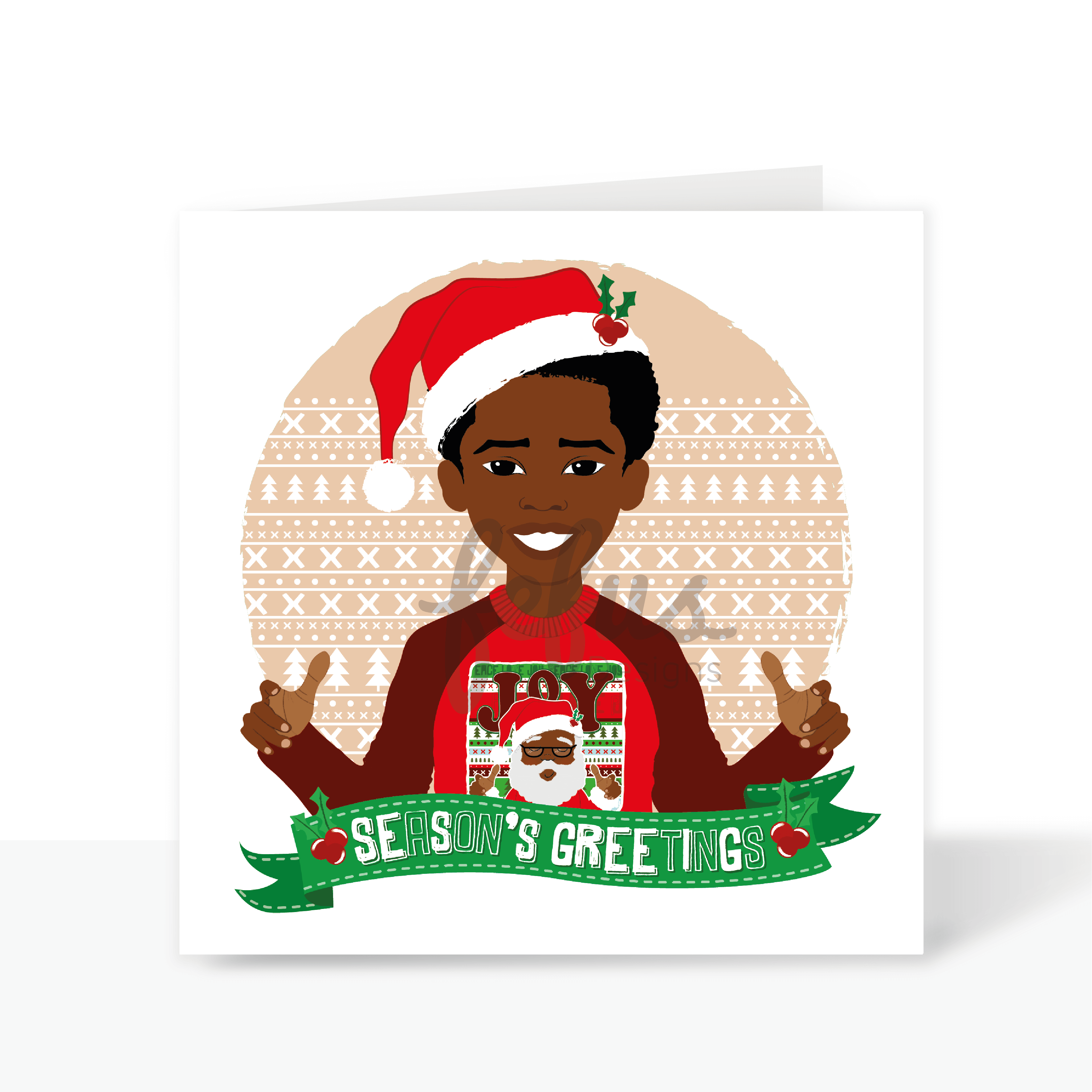 Fefus Designs branding on diverse kids holiday greeting card – Kane character series. Hand-drawn Christmas card featuring a biracial boy, perfect for spreading inclusive holiday cheer to children.