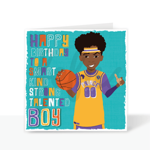 This is the perfect birthday card for an inspiring basketballer, This super cool, colourful and Inspirational Birthday Card features a mixed race basketballer boy with curly hair. This is the perfect card for that budding little basketballer, especially for a little one who wants to see someone who looks just like themselves!
