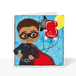 5 Today! What better way to celebrate his 5th birthday than with this super cute & colourful Brown Boy birthday card. Our cards are the perfect addition to a gift or just sent alone, for a little one who wants to see someone who looks just like themselves!