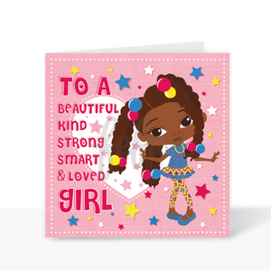 Say happy birthday in the cutest way possible! This one features a little black girl with afro twists and super cute hair accessories. Our cards are the perfect addition to a gift or just sent alone, for a little one who wants to see someone who looks just like themselves!