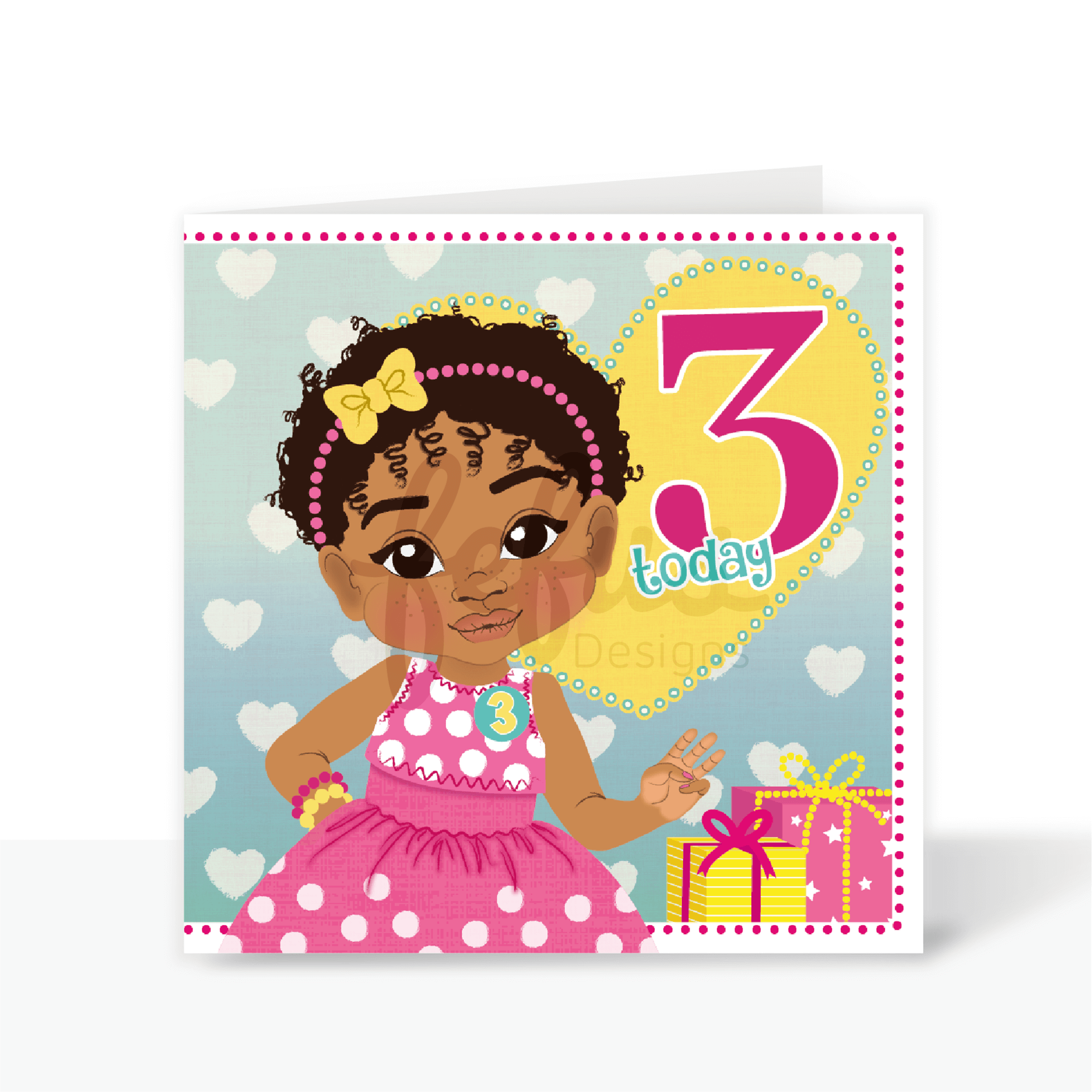 Unique 3rd birthday card for brown-skinned toddler girl – empowering design. Biracial girl with two afro puffs, hair bubbles in pink and blue, wearing a light pink top with star pattern, 'Birthday Girl' in multicoloured letters. Background features a yellow heart with a pink '3', blue 'Today' text, and colourful stars. Celebrate with Fefus Designs' Biracial Girl's 3rd Birthday Card for empowering multicultural kids.